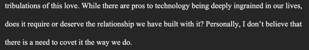 In my revisions I mainly tried to focus on whether I was able to get my point across. I would reread my thesis to remind myself of my overall goal of the essay and then go through each paragraph ensuring that the quotes and points I present align with my thesis. If the points or quotes in the paragraph do not align with my thesis I either try to tweak them a little, find new quotes or delete the whole paragraph which is something I ended up having to do. In the paragraph I put both ENG 110 students in conversation, however, when going back through I realized that the paragraph did not relate to my overall theme. I ended up having to cut the paragraph entirely. Another thing that added to my decision in cutting the paragraph was that it would have put me significantly over my word count, overall, the paragraph was not benefitting my work so I had to remove it. In my revision as well, I carefully went through my peer reviews that I received, reading through their comments and any notes I made during class. I did not always use what my peers said, as I came to my own conclusions about what needed to change and what didn’t. However, my peers did direct me in seeing that the paragraph I mentioned previously didn’t fit well with my thesis. They also informed me that I should cut my thesis shorter which I did end up following through with. All in all going through paragraph by paragraph and looking my peer review was a large help in revising my essay and being able to make it into a final draft.